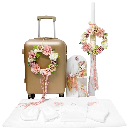 Χειροποίητο σετ βάπτισης με βαλίτσα, λαμπάδα, λαδοσέτ σε ξύλινη βάση (3 κεράκια, σαπουνάκι, μπουκαλάκι για λάδι), λαδόπανα (πετσέτα μεγάλη, πετσέτα μικρή, σεντονάκι, εσώρουχα) και διακοσμητικά στεφανάκια με λουλούδια.