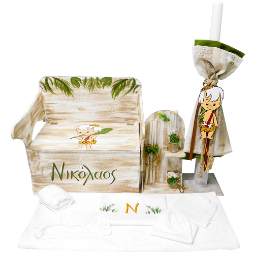 Χειροποίητο σετ βάπτισης με ξύλινο παγκάκι – θρανίο, λαμπάδα, λαδοσέτ σε ξύλινη βάση (3 κεράκια, σαπουνάκι, μπουκαλάκι για λάδι), λαδόπανα (πετσέτα μεγάλη, πετσέτα μικρή, σεντονάκι, εσώρουχα) και ζωγραφική στο χέρι.