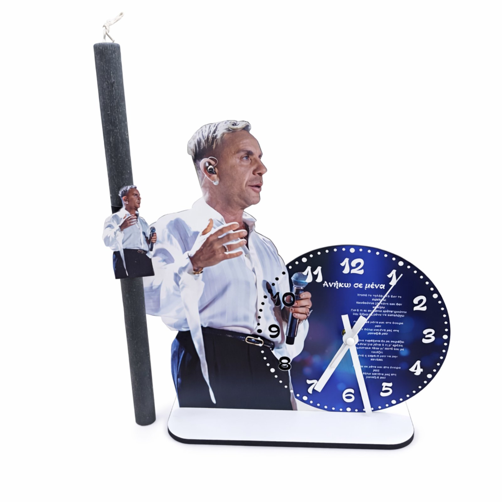 Μια ιδιαίτερη πασχαλινή λαμπάδα με επιτραπέζιο ρολόι εμπνευσμένη από τον Γιώργο Μαζωνάκη, σχεδιασμένη για όσους αγαπούν τις μεγάλες ελληνικές επιτυχίες και το ξεχωριστό του ύφος. Το σετ περιλαμβάνει επιτραπέζιο ρολόι με τον αγαπημένο καλλιτέχνη και χαρακτηριστικό στίχο από τραγούδι του: “Ανήκω σε εμένα”. Ένα δώρο που συνδυάζει μουσική, αισθητική και συναίσθημα, ιδανικό για όσους θέλουν να χαρίσουν κάτι διαφορετικό.