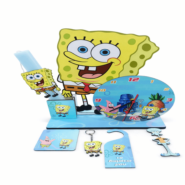 Χαρίστε στα βαφτιστήρια σας ένα μοναδικό και εντυπωσιακό δώρο με θέμα τον αγαπημένο ήρωα Μπομπ Σφουγγαράκης , που αποτελείται από χειροποίητη λαμπάδα με φιγούρα, σταντ διακοσμητικό που περιλαμβάνει ρολόι και μολυβοθήκη ,καθώς και έξτρα αξεσουάρ, (σουβέρ, μπρελόκ, μαγνητάκι και διακοσμητικό πόρτας δωματίου).