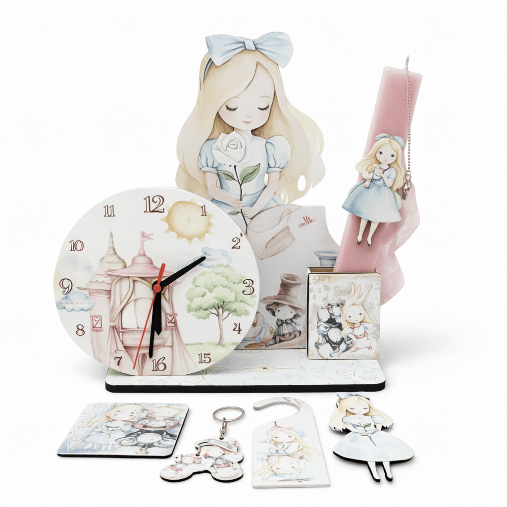Χαρίστε στα βαφτιστήρια σας ένα μοναδικό και εντυπωσιακό δώρο με θέμα την αγαπημένη πριγκίπισσα Αλίκη , που αποτελείται από χειροποίητη λαμπάδα με φιγούρα, σταντ διακοσμητικό που περιλαμβάνει ρολόι και μολυβοθήκη ,καθώς και έξτρα αξεσουάρ, (σουβέρ, μπρελόκ, μαγνητάκι και διακοσμητικό πόρτας δωματίου).