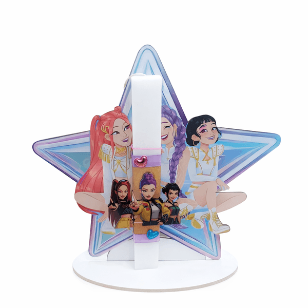Χαρίστε στα βαφτιστήρια σας ένα μοναδικό και εντυπωσιακό δώρο με θέμα K-Pop ,εμπνευσμένο από την ταινία ” Κυνηγοί Δαιμόνων”, (συχνά αναφέρονται ως “Huntrix” ή “Music Idols ” το οποίο αποτελείται από χειροποίητη λαμπάδα με φιγούρα και σταντ διακοσμητικό.