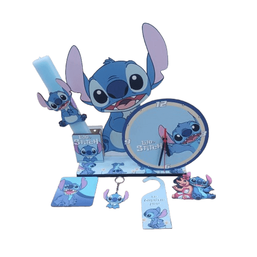 Χαρίστε στα βαφτιστήρια σας ένα μοναδικό και εντυπωσιακό δώρο με θέμα το δημοφιλή Stitch, που αποτελείται από χειροποίητη λαμπάδα με φιγούρα, σταντ διακοσμητικό που περιλαμβάνει ρολόι και μολυβοθήκη ,καθώς και έξτρα αξεσουάρ, (σουβέρ, μπρελόκ, μαγνητάκι και διακοσμητικό πόρτας δωματίου)